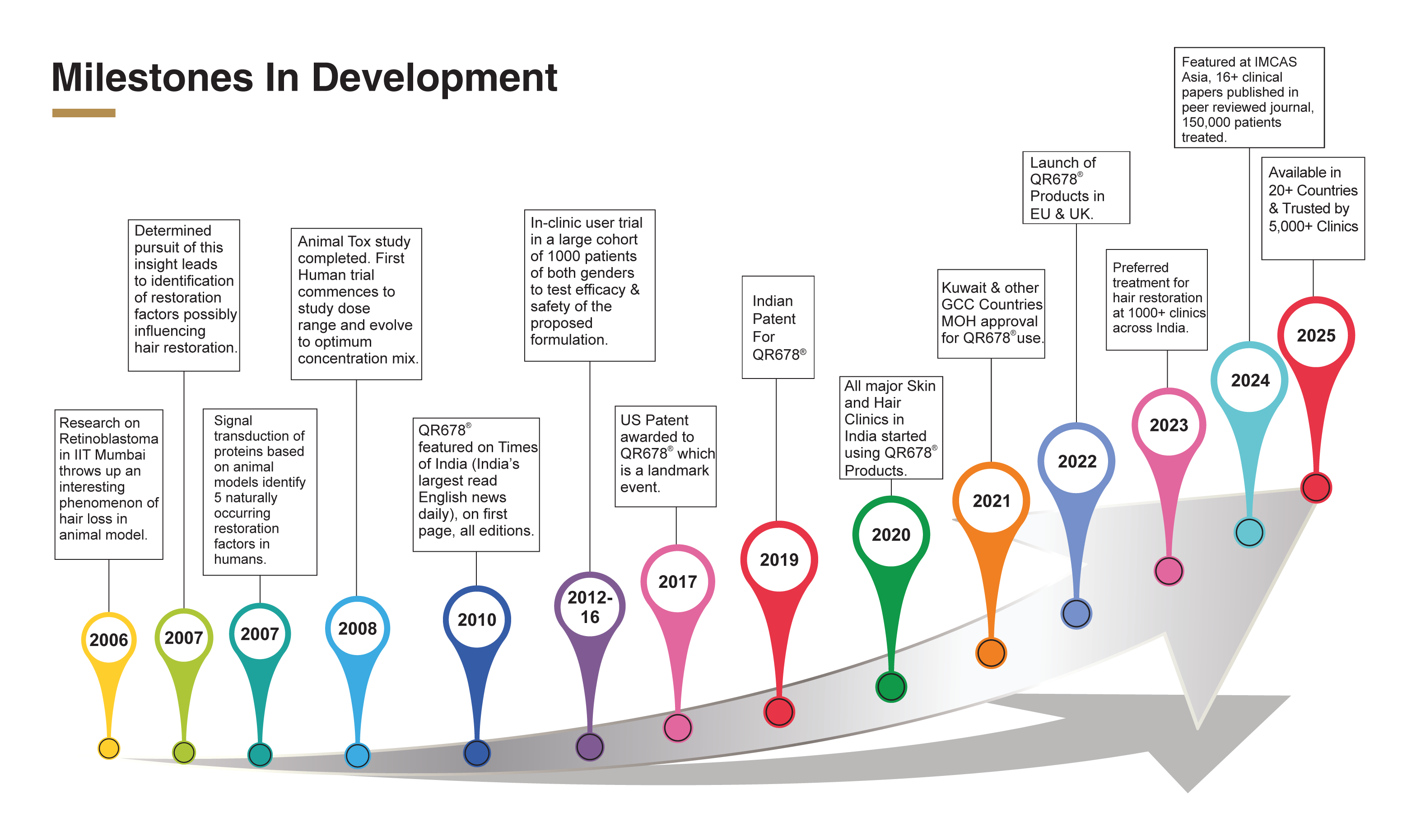 The QR678® research & development platform technology is a proprietary first-in-class technology. This science backed technology is giving rise to multiple products that arrest hair fall and address the thickness, density of hair follicles leading to greater coverage in hair loss. This R&D technology deals with multiple human hair growth related growth factors that are naturally present in our scalp making products derived from these completely natural. Research on this platform technology has resulted in this being awarded USA & Indian patents and has led to over 16+ clinical research papers being published with products derived from this unique technology. The hair growth factors penetrate deep into the scalp and provide nourishment to the scale. Unlike other treatments that contains harmful medication, products derived from QR678® are almost completely devoid of side effects.